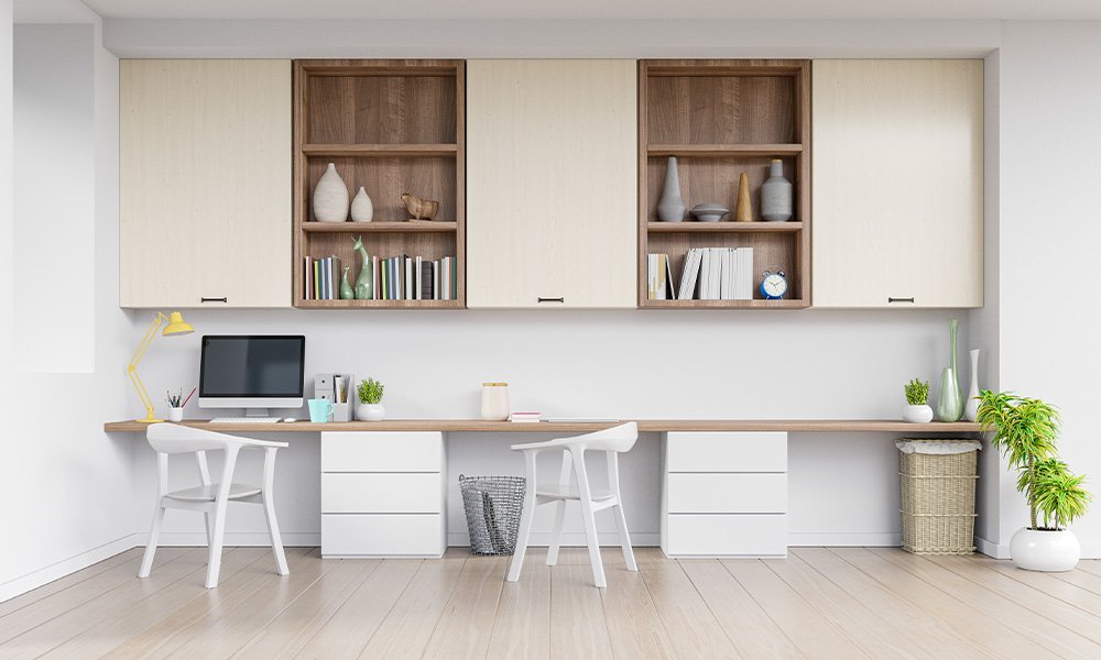 To maximize space, we focus on efficient layouts, built-in storage cabinets, vertical shelves, drawers, and custom furniture sized to the room. Floating shelves free up floor space, while corner desks and wall-mounted storage keep the workspace organized and functional. Our goal is to create an efficient home office that feels open, even in a limited footprint.